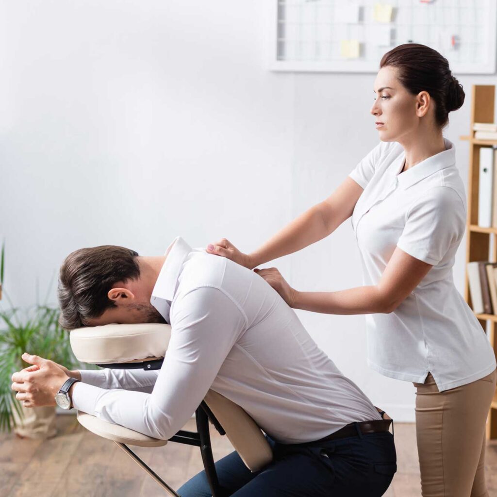 It is recommended that each chair massage sessions last between 10 and 30 minutes. Sessions longer than 30 minutes are also available, but usually, indicate that there is extensive work that the client would like to receive. Longer massage therapy appointments would be better accommodated through a table massage session at our personal and relaxing location.
